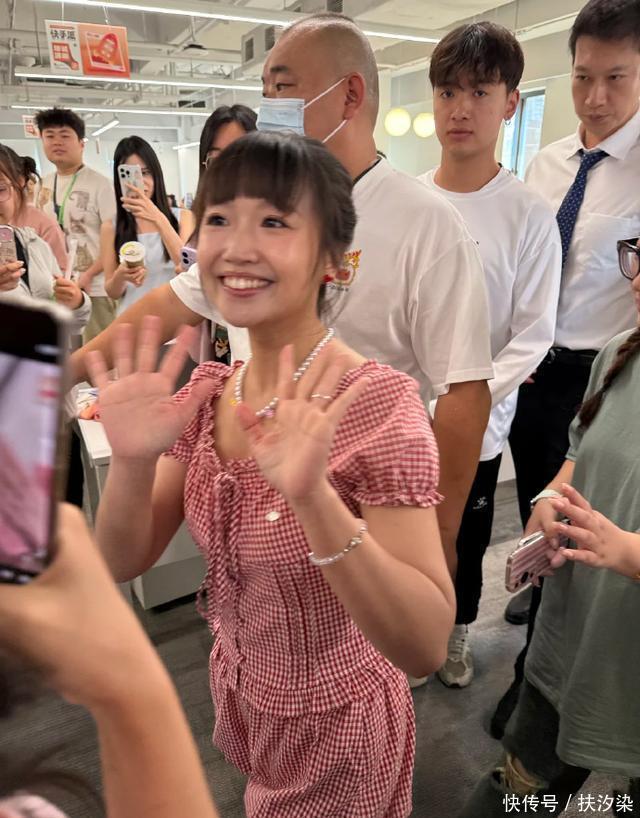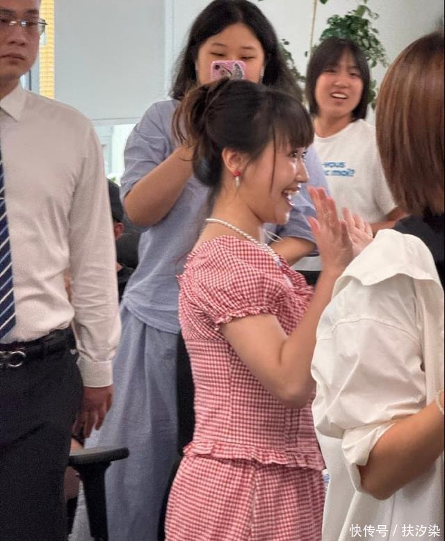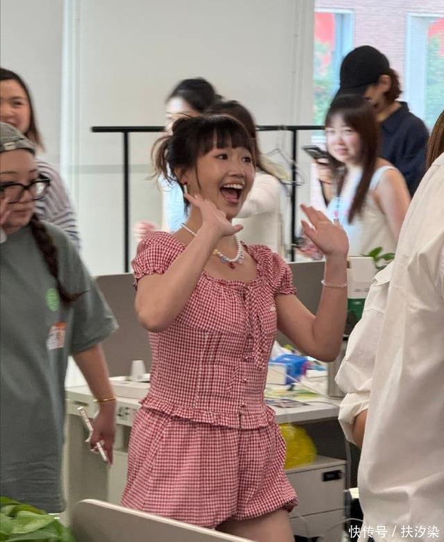 穿戴零丁红白小格子短裙套装,一如那时的皆刘海,可远远从电梯里走出来的那一幕,小小的一个东说念主,看起来好娇小,好明媚啊! 五官缜密,眼睛也亮亮的,和大家打呼唤也少量都不见荒废,给东说念主一种东说念主很nice的嗅觉。